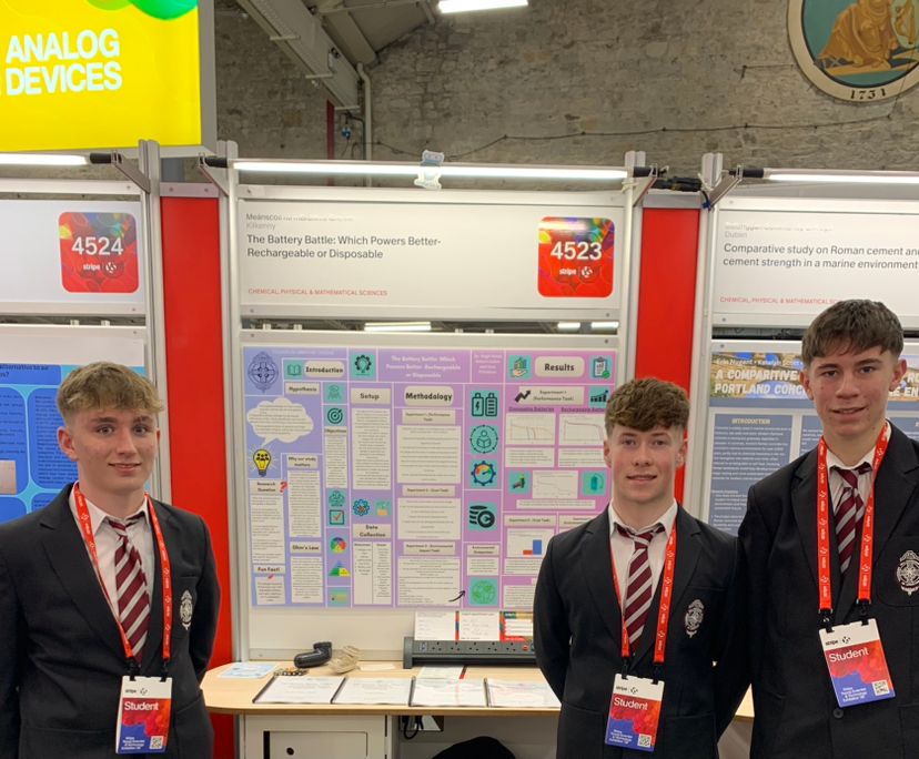 Transition year students Hugh Power, Robert Cullen and Dara O Sullivan travelled to Dublin today to participate in the Stripe Young Scientist and Technology Exhibition. The group will present their project – The Battery Battle: Which Powers Better- Rechargeable or Disposable, to industry experts as well as members of the public at the RDS over the next four days.